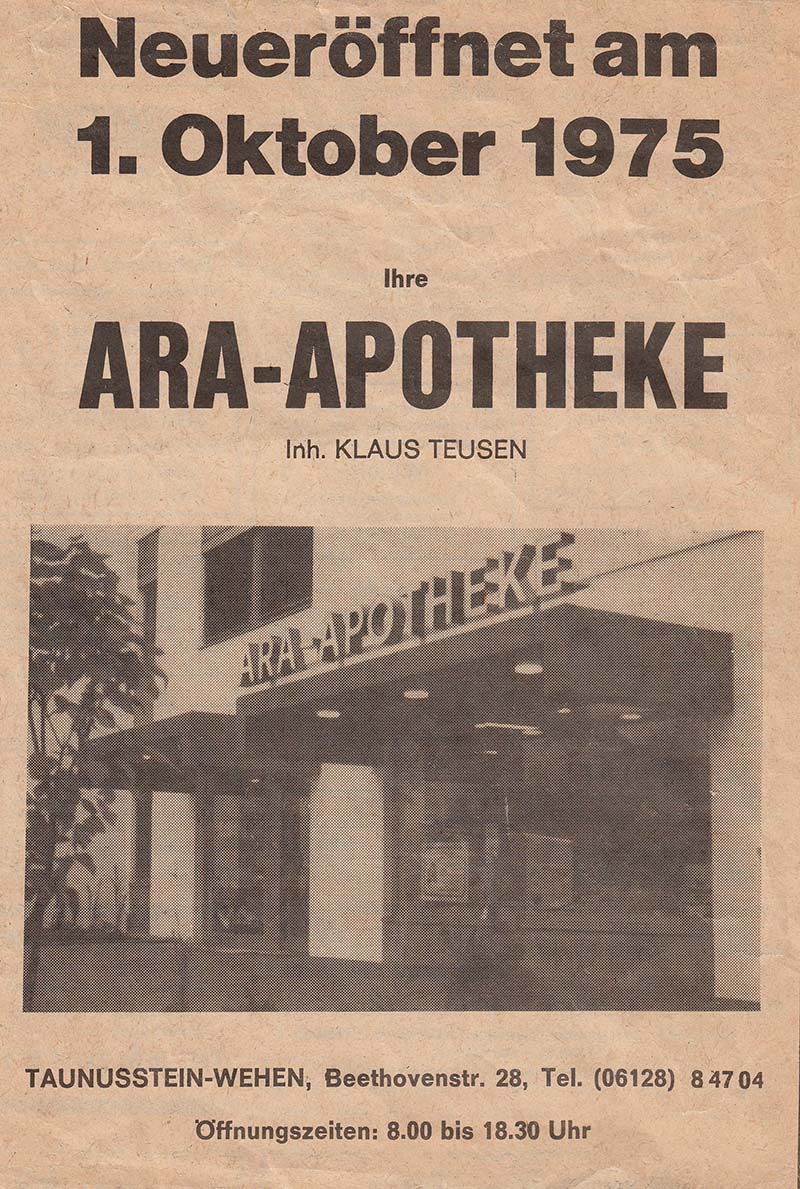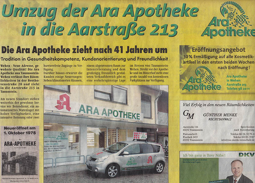 Wir freuen uns sehr, Sie auf unserer Homepage begrüßen zu dürfen. Herzlich laden wir sie dazu ein, unsere Apotheke, unsere Angebote und unseren Service näher kennenzulernen. Persönliche Beratung als Apotheke vor Ort liegt uns am Herzen. Besuchen Sie uns deshalb gerne an unserem Standort in Taunusstein-Wehen und lernen Sie das freundliche Team der Ara Apotheke vor Ort kennen. Wir freuen uns auf Ihren Besuch!